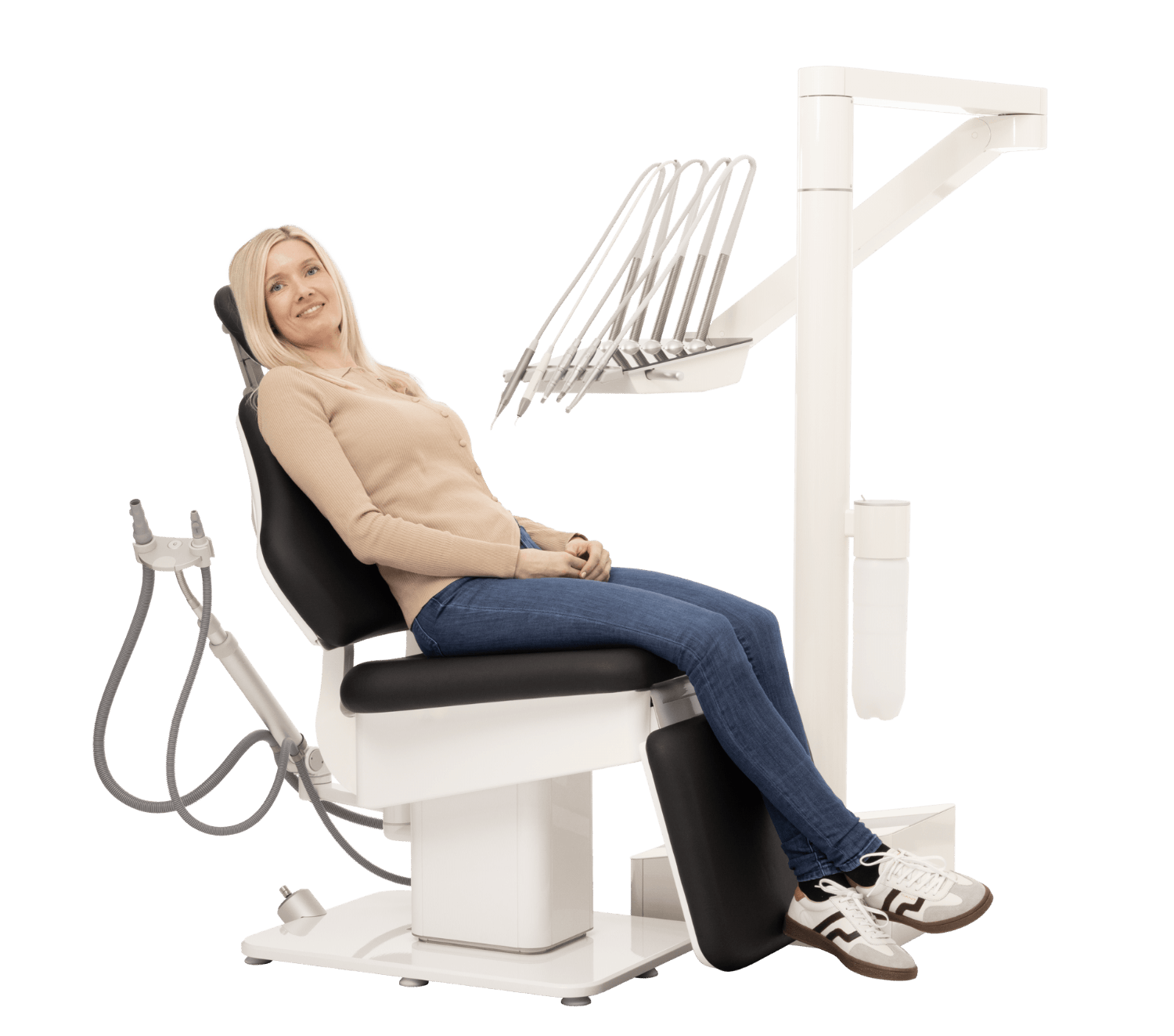 Para facilitar a los pacientes acceder al sillón y salir de él, el reposapiés se abate automáticamente a 90 grados cuando se eleva el respaldo. Esta función también permite una óptima posición cara a cara entre el paciente y el dentista.