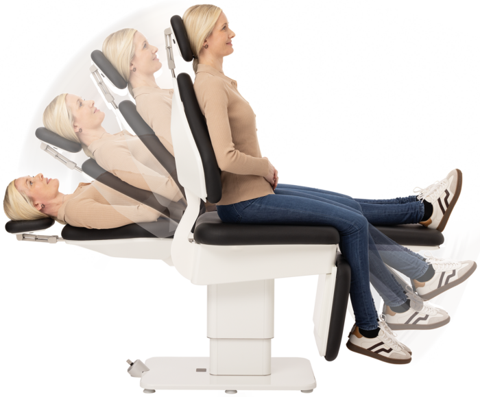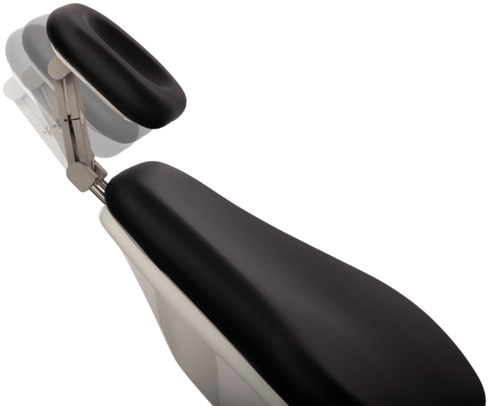 Al pasar al paciente de una posición sentada a una posición supina, el sillón se mueve con un movimiento suave, casi flotante, diseñado para apoyar la anatomía natural del cuerpo, en particular la relación entre la espalda y el cuello.