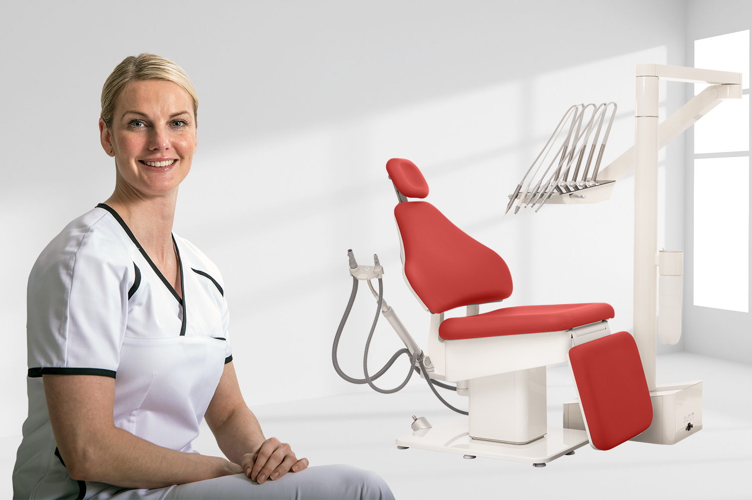 Para facilitar a los pacientes acceder al sillón y salir de él, el reposapiés se abate automáticamente a 90 grados cuando se eleva el respaldo. Esta función también permite una óptima posición cara a cara entre el paciente y el dentista.