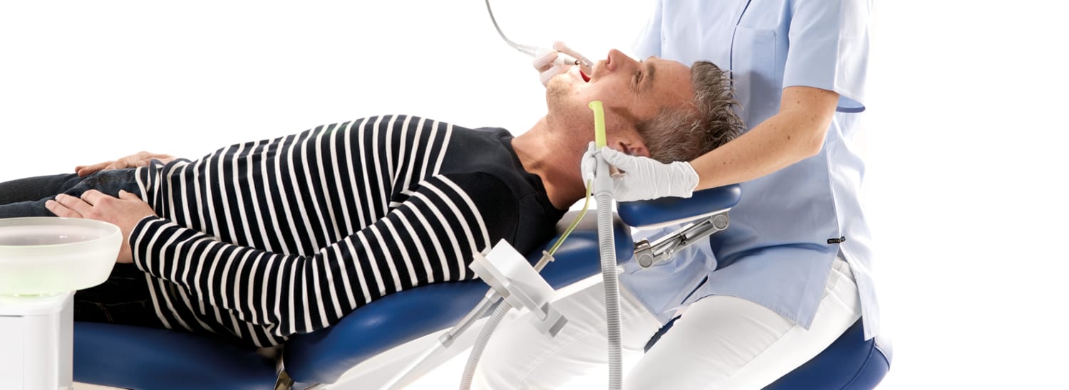El odontólogo disfruta de unas condiciones de trabajo idóneas, tanto si trabaja de pie como si lo hace sentado. El respaldo, fino y estrecho, ofrece una oportunidad óptima de acercarse al paciente durante el tratamiento.